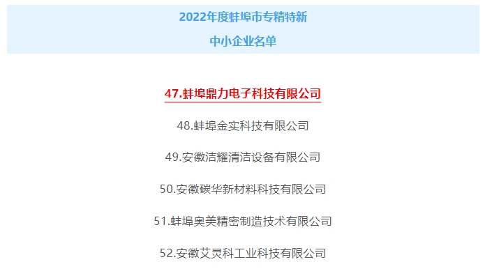 為積極響應(yīng)《蚌埠市智能工廠/數(shù)字化車(chē)間認(rèn)定管理辦法》《蚌埠市重大技術(shù)裝備首臺(tái)(套)認(rèn)定管理辦法》《蚌埠市工業(yè)設(shè)計(jì)中心認(rèn)定管理辦法》《蚌埠市綠色工廠評(píng)價(jià)管理暫行辦法》《蚌埠市服務(wù)型制造示范企業(yè)認(rèn)定管理辦法(試行)》等文件規(guī)定,經(jīng)我司積極申報(bào)申報(bào),縣區(qū)初審?fù)扑],相關(guān)部門(mén)審核,專(zhuān)家評(píng)審,征求意見(jiàn)以及公示等環(huán)節(jié)市經(jīng)濟(jì)和信息化局研究確定,蚌埠鼎力電子科技有限公司被認(rèn)定為2022年度蚌埠市“專(zhuān)精特新”中小企業(yè)。